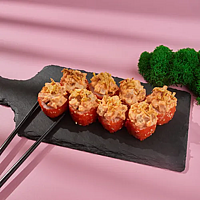 В составе: Чикен Чиз ролл, 3 запечённых суши с крабом, 3 запечённых суши с курицей.