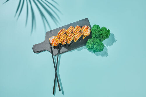 Блюдо японской кухни, объединяющее мягкую куриную начинку и аппетитную корочку. Украшается соусом унаги и рисовыми шариками.