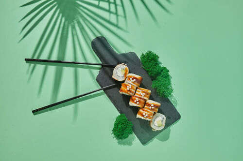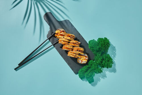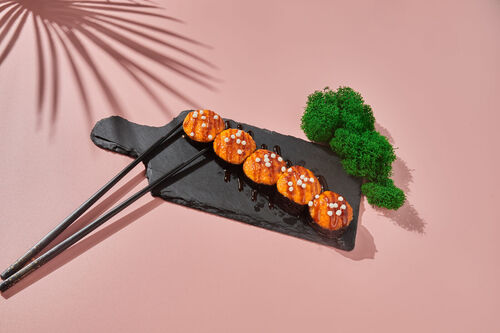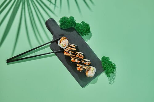Это яркое и насыщенное блюдо японской кухни, сочетающее в себе острый вкус и свежесть морепродуктов. Основные ингредиенты включают свежие ломтики угря, творожный сыр и омлет томаго, обернутые в мягкий рис с нори.