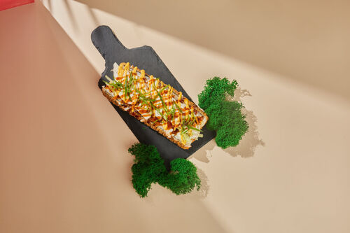 Запечённый ролл с беконом — это вкусное и сытное блюдо, которое сочетает в себе нежность снежного краба, куриной грудки и насыщенный аромат вкусного бекона. Украшается соусом унаги, горчичным соусом и луком фри.